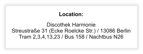 Herzlich Willkommen ...auf der Webseite von Berlins wohl ältester Tanzbarder “Discothek Harmonie”.Schon 1937 arbeitete die Oma des heutigen Betreibers als Serviererin in dem noch damals genannten “Tanzkaffee HEKO” in der Berliner Allee.Aus der Berliner Allee wurde 1953 die Klement Gottwald Allee und Anfang der 80er aus dem “Tanzkaffee HEKO” die “HO-Tanzbar Harmonie”.Nun arbeitete auch der heutige Betreiber als Servicekraft hinter der Bar und die Geschichte nahm weiter seinen Lauf.Nachdem nach der Wende die Klement Gottwald Allee wieder zur Berliner Allee wurde, war die damalige Location jedoch nicht mehr dem Ansturm der Partyfreudigen 90er Kinder gewachsen, ein neues Objekt musste her!1994 war es dann so weit, es folgte ein Umzug wie aus dem Lehrbuch. Eine neue Partyära war geboren und es wurden so einige Feste gefeiert. 2005 wurde dann aus dem damaligen, taffen Barkeeper, der nun heutige Chef der Harmonie. Unter dem noch immer aktuellen Namen “Discothek Harmonie” wurde/wird bis heute in der Streustraße 31(Ecke Roelckestr.) nahtlos weiter gefeiert. Jeden Freitag und Samstag ab 22 Uhr hieß und heißt es fort an: TANZEN - FLIRTEN - FEIERN und sich ordentlich amüsieren !!!Schaut einfach mal vorbei und überzeugt Euch selbst von dem einmaligen Flair, dem netten familiären Team, der gemütlichen Atmosphäre und den vor allem bezahlbaren Getränken. Und mit ein wenig Glück steht sogar der sympathische Chef selber mal wieder hinter dem Tresen und rockt das Haus wie zu alten Zeiten.